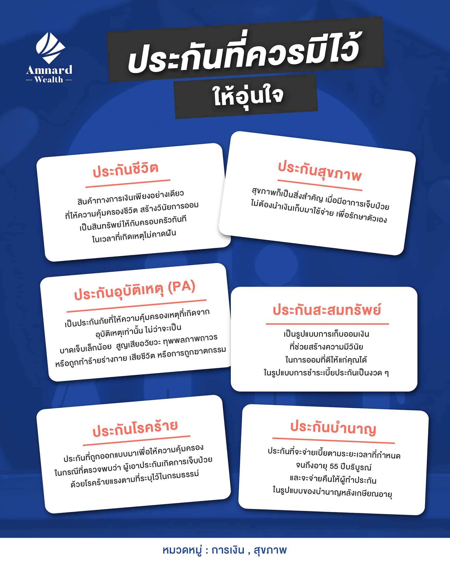 💡 หากอยากรู้รายละเอียดเพิ่มเติมมากกว่านี้ ว่าประกันแต่ละประเภทแตกต่างกันอย่างไร ต้องควรทำประกันประเภทไหน บริษัท อำนาจ เวลธ์ จำกัด